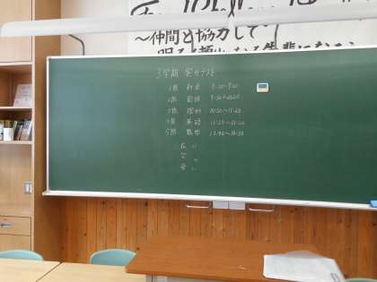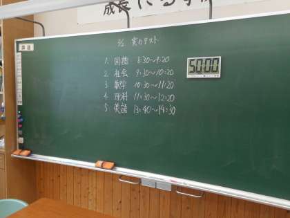 本日は、3年生が私立高校一般入試です。それに合わせて、1、2年生は、1限から5限まで5教科の校内学力調査を実施します。日頃の学習成果が発揮できるよう、集中して取り組みます。