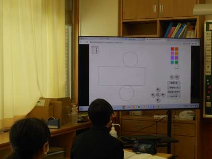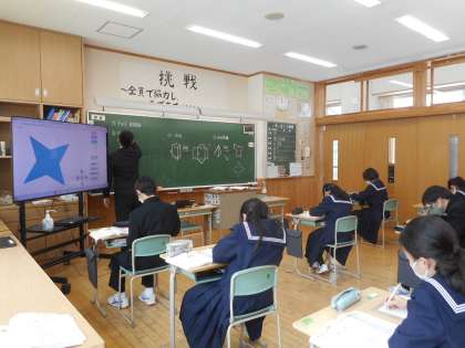 本日の授業は「立体の展開図」です。モニターを参考にしながら三角柱、四角柱の展開図をノートに書きます。展開図から表面積を求めます。
