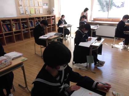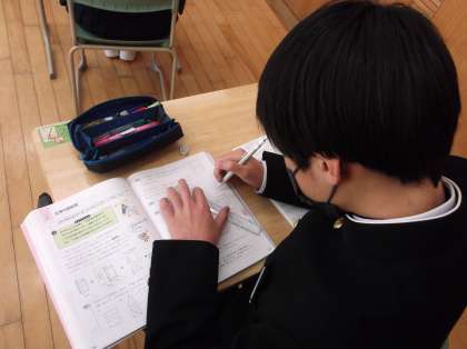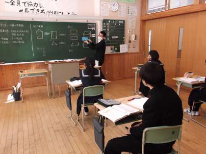 「立体の投影図」について、立方体を平面で表すために、平面図と立面図を使ってかく方法について学習しています。