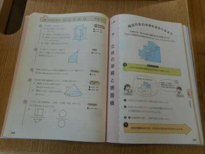 本日の学習は、「基本の問題」です。正五角形から、平行な面と辺、平行な辺と面、垂直な辺と面を図に印を付けた後に、ねじれの位置にある辺と辺を考えます。一問解くごとに、教科担任と確認します。
