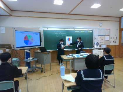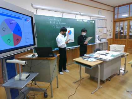 2年生は英語の授業で、アンケート調査で調べたことを発表し合いました。好きな本の種類や学校行事等について事前にアンケート調査を行い、結果から分かったことを英語で伝えました。