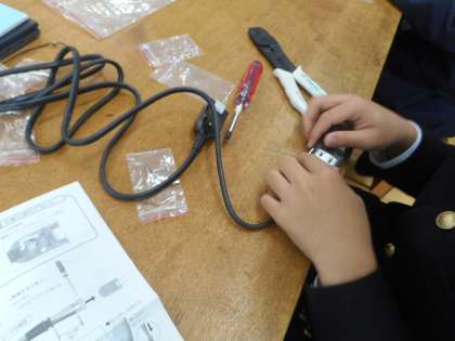 本日の学習課題は「素線を切らず、コードを処理しよう」です。安全に使用するために、キットの様々な表示を確認しながら、テーブルタップを組み立てます。