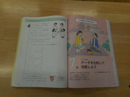 本日の学習は、「確率」です。教科書の最後の応用問題に取り組みます。A、B、C、Dの4人が、1回じゃんけんをする時、あいこになる確率を樹形図を使って求めます。手間をかけて、何度も樹形図をかく練習をします。