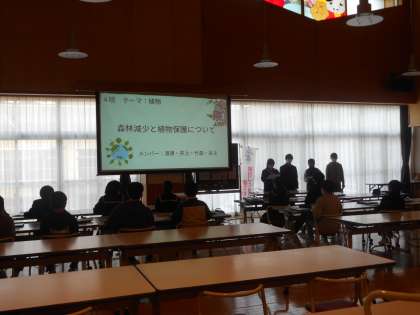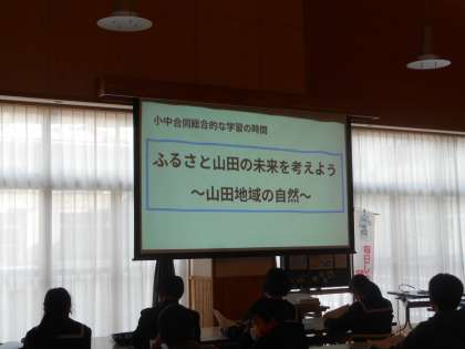 小学校6年生と中学校1年生合同の総合的な学習の時間に、「ふるさと山田の未来を考えよう〜山田地域の自然〜」と題して取り組んだ学習の発表会がありました。児童生徒がそれぞれの班で協力し、植物、自然災害、山・川、動物の点から考えた内容でした。