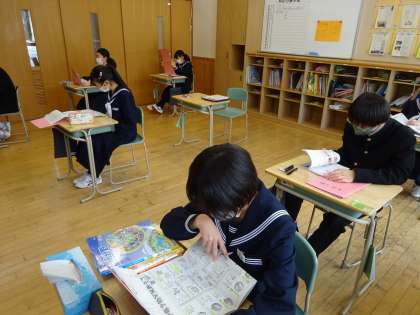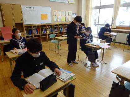 1年生の朝の様子です。学年末評価に向けて、学習内容を直前まで確認し、がんばっています。