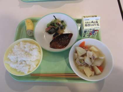 今日の給食は、ごはん、牛乳、鯵のみりん焼き、チンゲンサイソテー、豚汁、バナナでした。