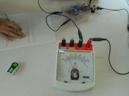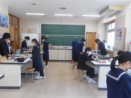 本日の学習課題は、「コイルのまわりの磁界は、どのようになっているか」です。コイルに電流を流し、鉄粉や方位磁針を使って、コイルのまわりにできる磁界の様子を調べ、各自レポートにまとめます。