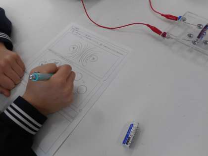 本日の学習課題は、「コイルのまわりの磁界は、どのようになっているか」です。コイルに電流を流し、鉄粉や方位磁針を使って、コイルのまわりにできる磁界の様子を調べ、各自レポートにまとめます。