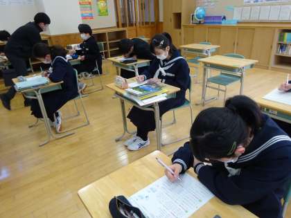 1年生の英語の授業では、これまで学習した文法を復習しました。be動詞と一般動詞の違いや、三人称単数現在等、既習の内容が正しく身に付いているかを確認していました。