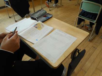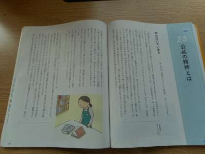 本日の教材は「本が泣いています」です。公共の精神の点から改善したらよいこと等考えたことをワークシートに記入し、一人ずつ発表します。