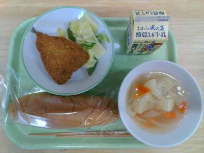 今日の給食は、牛乳 コッペパン アジフライ アスパラサラダ ポテトスープです。