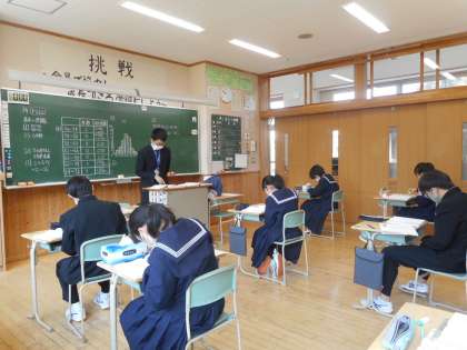 本日の学習は、「データ分布の特徴の表し方」に関する基本の問題に取り組みます。データ分布の特徴を伝える、平均値、中央値、最頻値、範囲の求め方を復習します。一問ずつ、教科担任と確認しながら理解を深めます。