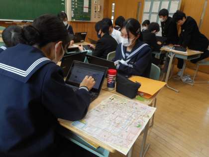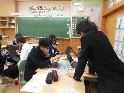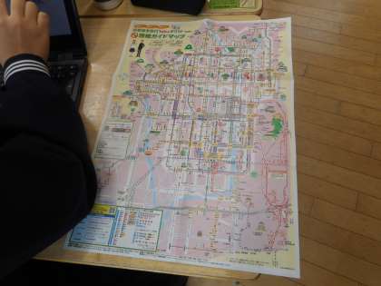 本日の学習は、5月に予定している修学旅行で見学する京都市内の移動手段と所要時間を組み立てます。端末や路線ガイドブックを利用し、班で話し合いながら進めていきます。