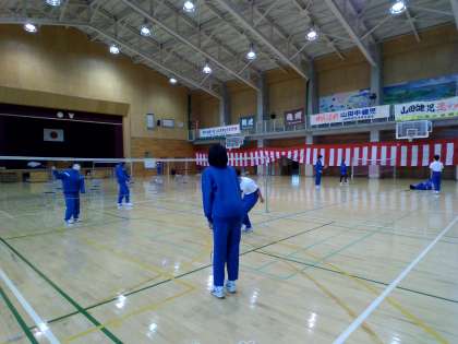卒業証書授与式のために張られた紅白幕の中で、バドミントン競技の練習です。試合形式で楽しそうに取り組んでいます。