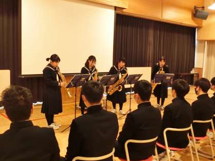 卒業証書授与式を明後日に控え、今日は「卒業を祝う会」を開催しました。吹奏楽演奏や出し物等で、3年生と過ごす最後のひとときを楽しんでいました。