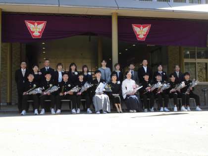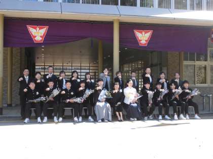 まじめな表情で撮影した後、最後は、保護者も一緒に気合いを入れた「せーの、イェーイ!」