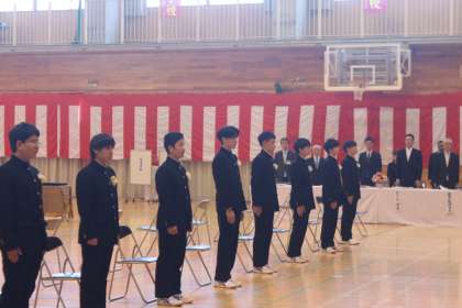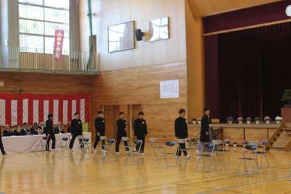 本日、山田中学校では第76回卒業証書授与式を行いました。やや緊張した表情で、前を向いて堂々と入場しました。