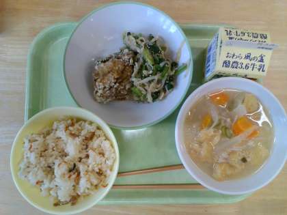 今日の給食は、牛乳 五目ごはん 魚(鯖)のかば焼き はりはり和え みそ汁です。