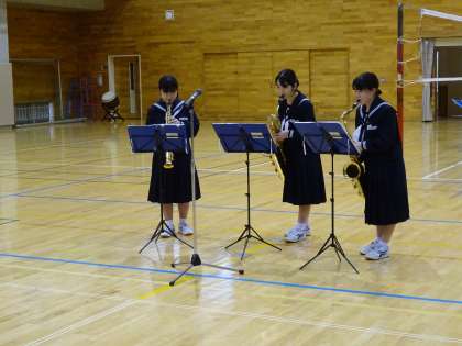 休憩をはさみ、各部の紹介を行いました。吹奏楽部は、この日のために練習してきた曲を演奏し、各楽器の紹介を行いました。卓球部は、数種類の基礎打ちを披露しました。
