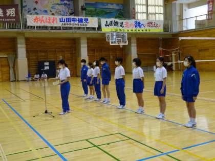 バレーボール部は、パスやスパイク、サーブを披露しました。陸上競技部は、毎日取り組んでいる練習メニューを紹介しました。この後、現在休部している野球部、特設部の駅伝部、スキー部しました。13日からの体験入部で、各部の活動を大いに楽しんでほしいです。