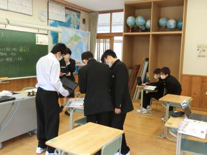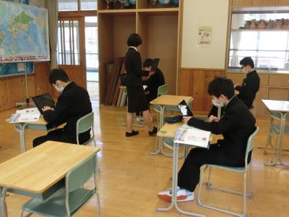 1年生の学習参観は、社会科の授業で「古代国家と文明」について学習しました。端末を活用して調べたり、調べたことを見合ったりして、理解を深めました。