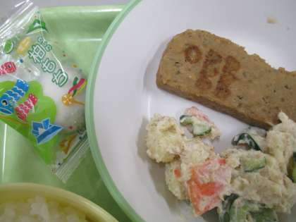 今日の給食は、ごはん、牛乳、ごまポテトサラダ、こいのぼりハンバーグ、わかたけ汁、柏餅でした。5月5日のこどもの日に向けてのメニューです。