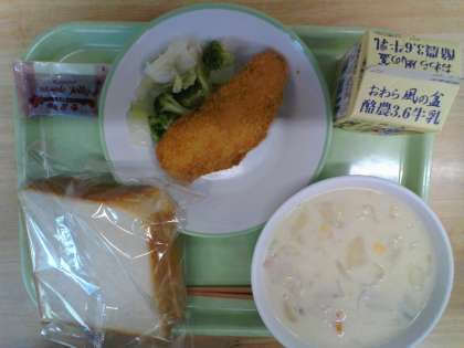 今日の給食は、牛乳 食パン サーモンフライ、ブロッコリーサラダ、クリームチャウダー、メープルジャムです。