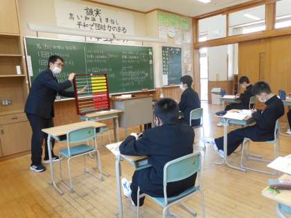 本日の授業は、「減法」です。正負の数で、2つの数のひき算を考えます。なぜ、減法は加法仁置き替えて計算できるのかについて、生徒が説明しました。