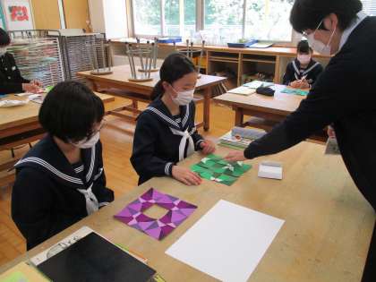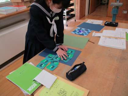 2年生の美術の授業では、パターンデザインに取り組んでいます。いくつか候補を考え、1つ選んで台紙に貼っていきます。どんな模様ができるのか楽しみです。