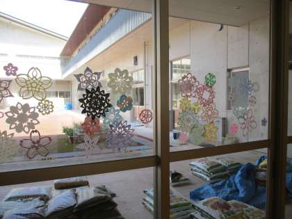 3年生が美術の授業で取り組んだ紋切りの作品が、美術室前に飾られています。日光に照らされると、色とりどりの折り紙で切られた模様が、より丁寧に仕上げられたことが分かります。