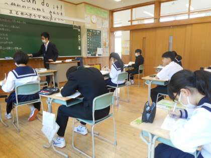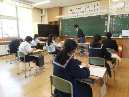 本日の授業は、「式による証明」です。教科書を離れ、「連速した2つの奇数の和は、偶数になる」について、証明する手順を復習します。生徒は、教科担任と確認後、新たな式による証明問題に挑戦します。