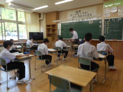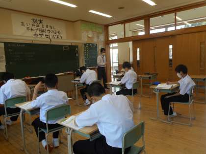 本日の学習は、「乗法」です。符号が同じ数と異なる数の積では、どのようになるのかを考えます。解き終えた生徒から、「ヨッシャー完璧!」と喜ぶ声が聞かれました。