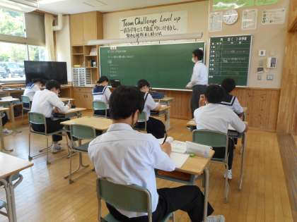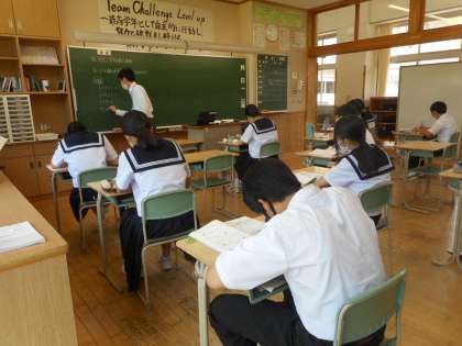 本日の学習は、「文字を使った説明」です。2つの続く奇数の積に、1を加えると、どのような数になるのかを、文字を使って証明する手順を学習します。生徒は、教科担任から出題された類似の問題にも挑戦し、理解を深めました。