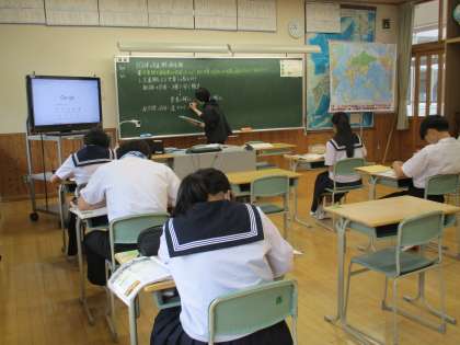 社会では、日本の交通網・通信網について学習しています。先生からの問いに対して、生徒たちは意欲的に発言をしています。