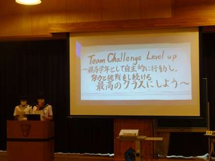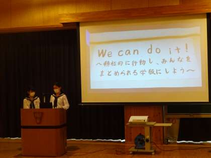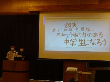 執行部、各委員会からのお知らせの後、各学年の代表生徒が学級目標とそれに込められた思いを紹介しました。