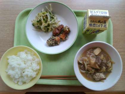 今日の給食の献立は、牛乳、ご飯、ちくわの南部揚げ、甘酢和え、すき焼きです。