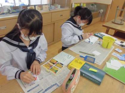 2年生は、美術の授業でモダンテクニックに挑戦しました。ポスターカラーやクレヨン等を用いて、様々な技法の特徴をつかみ、その良さを味わっていました。