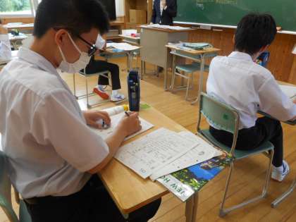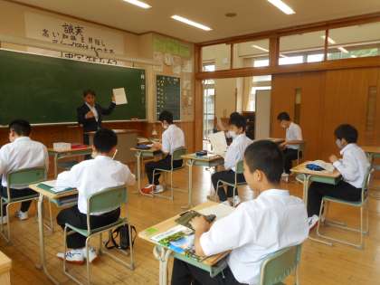 本日の授業は、先日受けたテストの解説を聞きました。be動詞や一般動詞、副詞を中心に復習しました。解説を聞いた生徒から、疑問に思ったところの発言がありました。それに対して、教科担任からの助言や生徒同士で意見を出し合い、学びを深めていました。