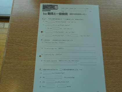 本日の学習は、「be動詞と一般動詞」の違いや法則について、ワークシートを使って復習します。生徒は、説明を聞きながら質問したり、自分にとって大事だと思うポイントについてメモを取ったりして、理解を深めていました。