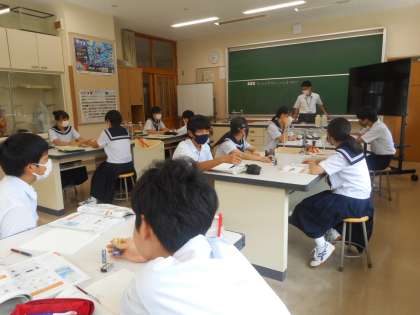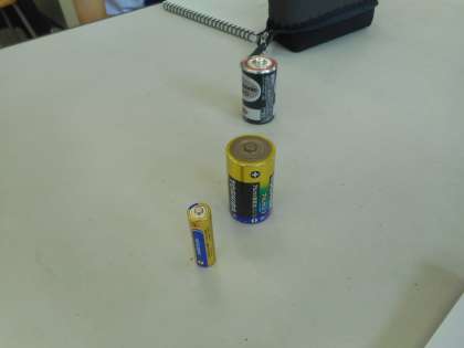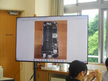 本日の学習課題は、「身の回りの電池には、どのような違いがあるのか」です。各班に配られた3種類の電池の使われている用途、ラベルに書かれている内容から、違いを見付け、全員で意見を出し合います。携帯電話に使われている電池の説明もありました。