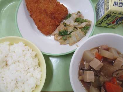 今日の給食は、ごはん、牛乳、高野豆腐と冬瓜の煮物、グリーンアスパラのごまだれ、あじフライです。午後の授業も頑張ります!