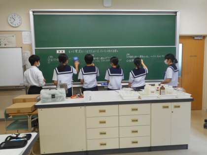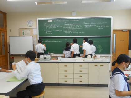 本日の学習課題は、「大きな電流を取り出すには、どのような工夫が必要か」です。最初の実験データより更に大きい電流を取り出すために、実験計画を見直しました。新たな実験結果を各班ごとに、黒板に発表し結論を考えます。