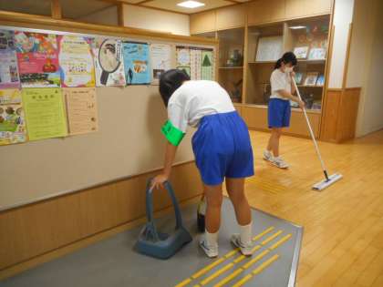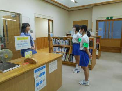 2年生は、本日7月3日から7月7日まで、「社会に学ぶ『14歳の挑戦』」の活動を各事業所で行います。本校に隣接する富山市立山田図書館で活動する生徒は、朝礼の後、利用客を迎えるために、玄関清掃から始めていました。