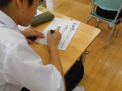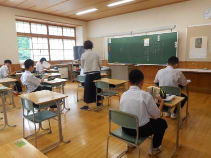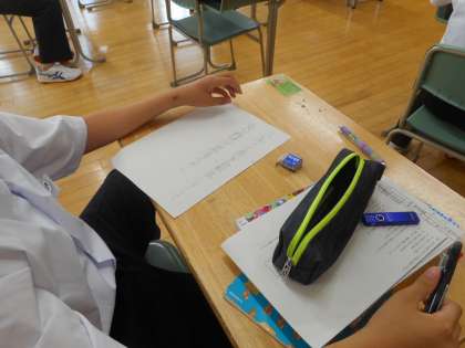本日の学習課題は、「比喩を使って、商品・企業をPRする広告を作ってみよう」です。生徒は、「比喩」の使い方が正しいかどうか、教科担任や周囲の生徒に確認しながら、課題を完成させていました。