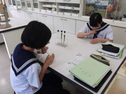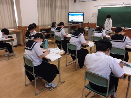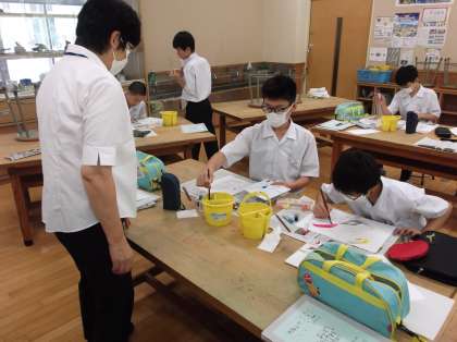 1年生は、美術の授業で、淡い色を使って彩色しています。2年生は、理科の授業で、石灰水に息を吹き込む実験を行い、光合成に二酸化炭素が必要なことを学習しています。3年生は、社会の授業で、ユニバーサルスタジオジャパンがアトラクションに設置している一人専用通路を例に取り上げ、効率か公正かについて学習しています。