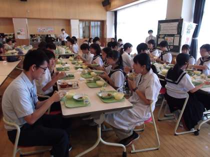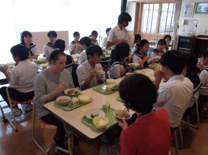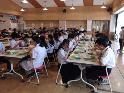 今日は、1学期最後の給食でした。新型コロナウイルス感染症の感染状況を気に掛け延期していた、給食委員会企画のランチルーム会食を実施しました。全校生徒が集まっての久しぶりの会食に会話が弾みました。