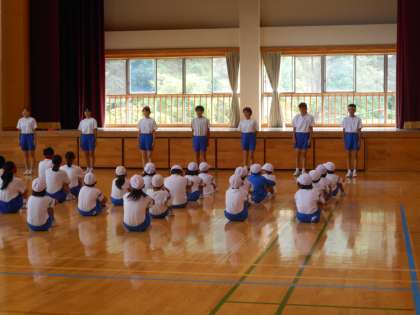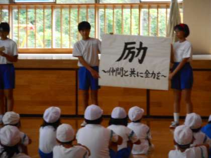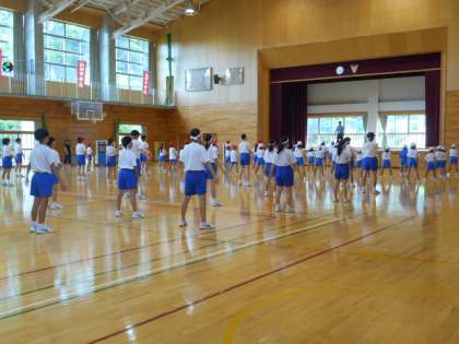 本日3限に、小中合同での結団式を行いました。実行委員の紹介、スローガンの発表、各団のリーダー紹介がありました。最後に、小学校の先生の指導により、ラジオ体操の動きを小中全員で確認しました。
