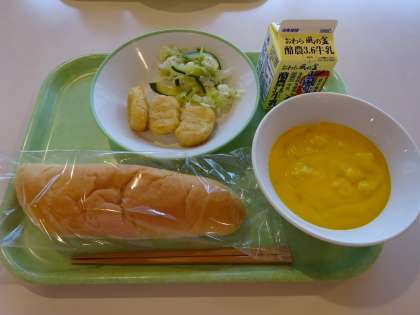 9月7日の給食は、コッペパン、牛乳、チキンナゲット、えごまドレッシングサラダ、かぼちゃポタージュでした。