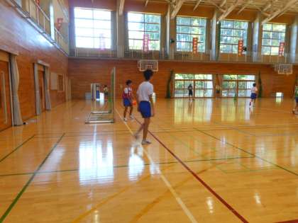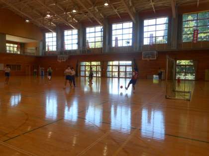 本日の授業はフットサルで、学習課題は、「パスをして、空いているスペースに移動する」です。男女混合で2チームに分かれ、チーム間でパスが出しやすい空間をつくることを考えます。