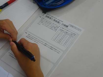 1年生は、水に溶けている溶質を取り出す方法について学習しました。後半は、取り出せる溶質の量についての計算問題に取り組み、理解を深めていました。